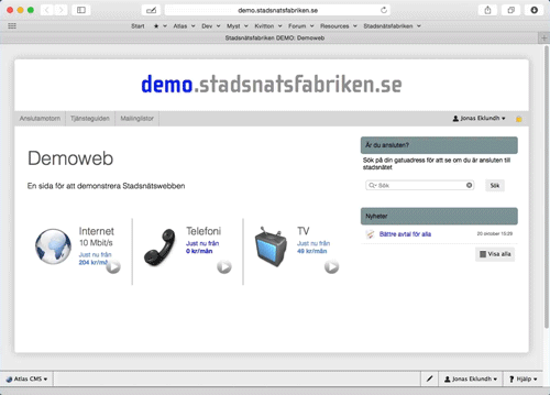 Adminläget i Atlas når du via den lilla pennan i botten på sidan, vilket i sin tur visar de olika adminkontrollerna för de moduler som finns på sidan.
