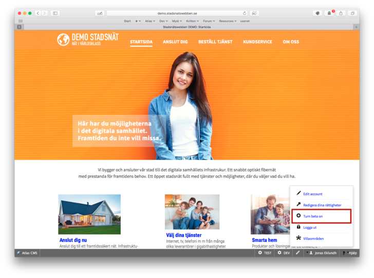 Kom ihåg att stänga av betaläget när du testat klart för att återgå till normalversionen. Om en funktion är i beta så bör det inte förändra någon funktion i Atlas men för säkerhets skull rekommenderar vi att man bara använder betaläget för testning.