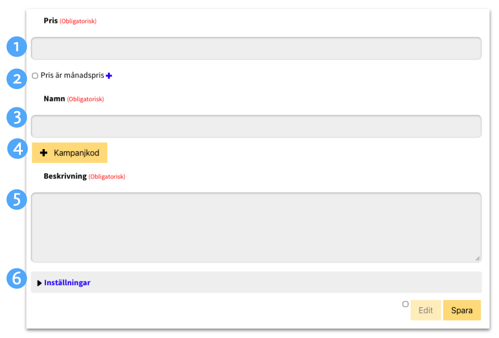 - Ange ev. Kampanjkod. Om prisalternativet endast ska visas för kund som anger en specifik kampanjkod skriver ni in den här, ex: "fiberkampanj"