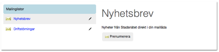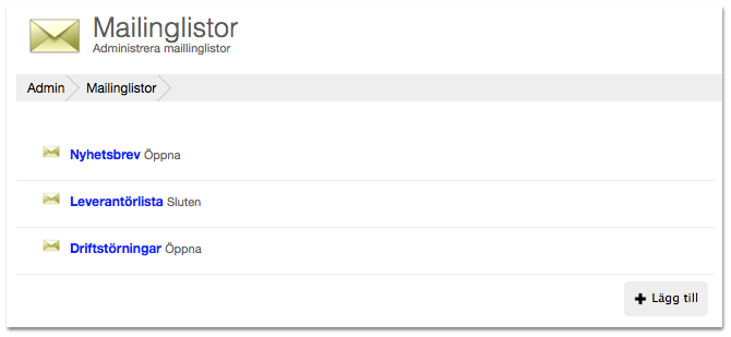 Klicka på Lägg till för att skapa ny lista. Du kan välja om den ska vara öppen eller sluten, d.v.s. om den ska synas publikt eller inte.Klicka på en lista för att redigera, skicka e-mail eller lägga till prenumeranter. Du kan även importera tab- eller semikolonseparerad lista med mailmottagare (Namn; epost) i t.ex. .csv eller .txt -format. Klicka på Lägg till medlem för att lägga till befintlig medlem som prenumerant i listan.