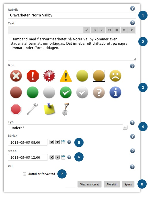 Det kan finnas tillfällen då man vill skapa andra typer av meddelanden än störningar. Därför kan du ange andra typer, t ex Information, och välja andra ikoner vid dessa tillfällen.Ett gott råd