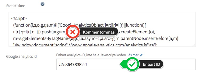 Så från och med på onsdag den 14 december så kommer vi rensa era fält med "Statistikkod" och så har vi ett nytt fält för "Google Analytics ID" där bara ID-koden för ett Analytics-konto anges, så fixar vi resten av statistikkoden automatiskt åt er.
