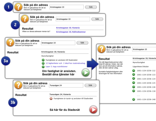 3a) Genom att klicka på sin adress får besökaren mer information om fastigheten och vilka lokal-ID som har ett stadsnätsuttag. Klickar han vidare får han fram information om uttagsnummer och Layer 2/Layer 3.