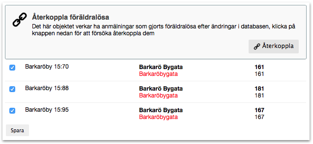 När man klickar på återkoppla så visas en lista på dessa anmälningar och hur deras information skiljer sig från adressdatabasen. Kryssa i de som du vill uppdatera och klicka på spara så uppdateras anmälningarna till värdet i adressunderlaget och dom är inte längre föräldralösa.