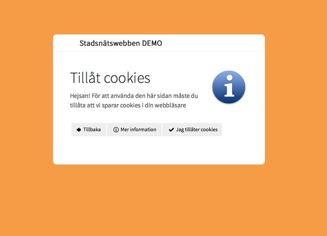 Den här är lite aggressivare, om ni väljer den här, så sätter vi ingen cookie utan att besökaren har godkänt det. Notera dock att för de sidor som använder cookies så måste vi stoppa helt och visa den här informationen, som PTS gör. Du kan inte använda sidan alls förrän du har godkänt.Till skillnad från PTS så visar vi inte detta på sidor som inte sätter cookies, så startsidan och Cookie information-sidan kan visas utan problem (ironiskt att informationen om cookies som PTS länkar till i sin motsvarande blänkare inte kan läsas utan att man godkänt cookies).
