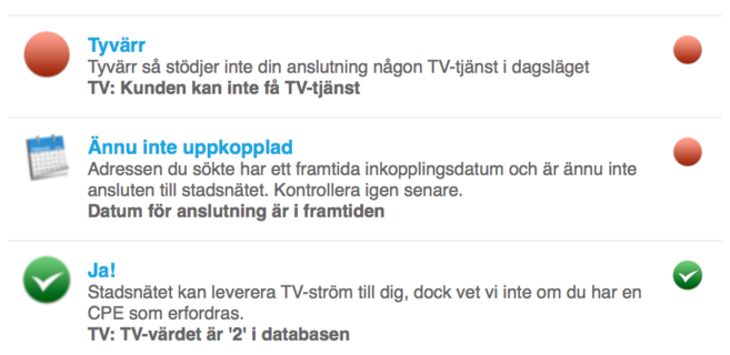 Tidigare fanns det en global inställning i Tjänsteguidens inställningar var "Okänt" status betydde, som till exempel om en kund söker på sin adress och Marknadsdatabasen inte har information om kundens porthastighet, om det fanns en CPE eller om TV kan levereras så är status "okänt" och standardinställningen är att tillåta beställning även om status är okänt men med den globala inställningen kunde man ändra det till att "okänt" inte tillät beställning, nu kan man bestämma det per separat "okänt"-svar i MeddelandefunktionenAnvänd AdminTjänsteguidenMeddelanden för att redigera meddelanden för "Internet: Ingen kapacitetsinformation i databasen", "Telefoni: Ingen CPE-information i databasen", "TV: Ingen TV-information i databasen" samt "Datum för anslutning är i framtiden" för att avgöra hurivida någon av dem tillåter eller inte tillåter beställning i Tjänsteguiden.