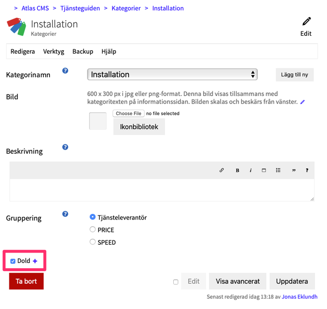 Funktionen syns man redigerar en kategori i modulen AtlasTjänsteguidenKategorier