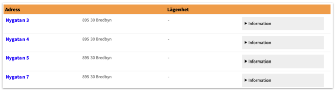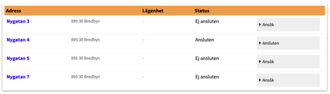 När kund söker på en ofullständig adress i Anslutamotorn (ex: "Nygatan" ist för "Nygatan 5") visas en lista med adressförslag där kund får klicka på sin adress. (Om ni inte kryssat för "Adressök visar endast exakt träff", då måste kund söka på fullständig adress för att få träff) I denna lista visas även status för respektive adress