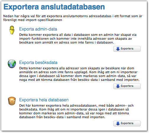 Tänk dock på att vid en import så kommer all data markeras som "admin-data", så om en besökare anmäler adresser Storgatan 42, så kommer den med i exporten om ni väljer besöksdata, men om ni väljer att importera denna i databasen utan att tömma besöksdata så kommer det bli dubletter.