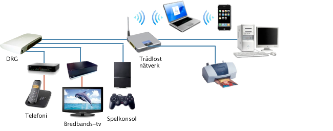 Från uttagen på DRG:n kopplar du in datorer (eller nätverk), tv-box och telefonibox. Tv-boxar och telefoniboxar får du från din tjänsteleverantör.