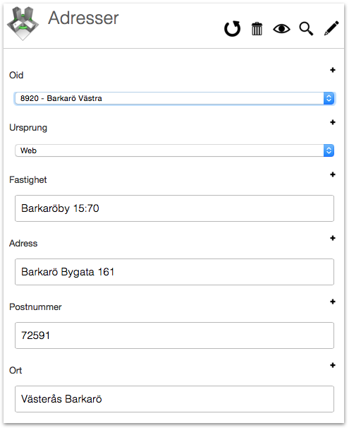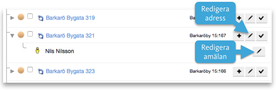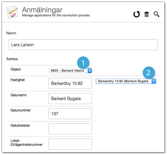 Ni kan även fylla i egen information i dessa fält, men om motsvarande adress inte finns på det objektet i databasen så kommer anmälningen inte knytas korrekt till datat på det området, tyvärr. Om du vill flytta en anmälan till en adress som ännu inte finns i databasen så måste du först skapa den adressen på ett område som du vill flytta anmälan till, det sker inte automatiskt.