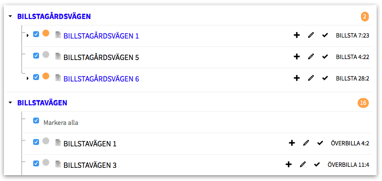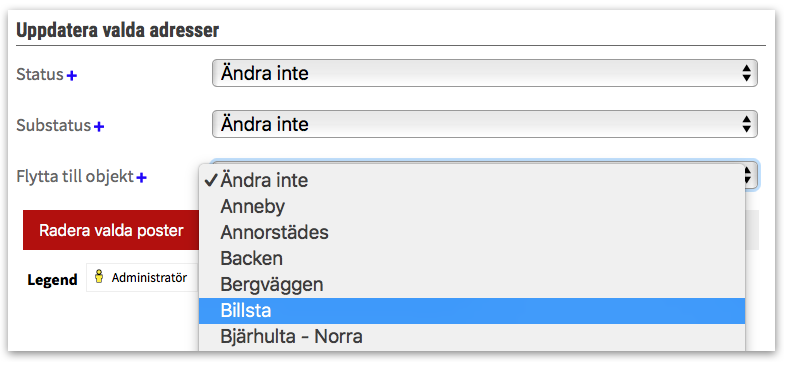Om ni t.ex. vill slå ihop två eller flera områden kan ni flytta flera adresser och deras anmälningar samtidigt.Gå in på adminsidan för aktuellt område och markera de adresser som ska flyttas