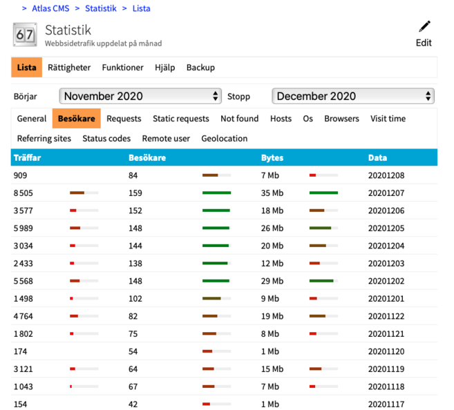 Med ett verktyg som heter GoAccess så analyseras dessa loggfiler och sammanställs till data som vi försöker presentera på ett tydligt och överskådligt vis. Ni hittar dessa under Atlas CMSStatistik (Om du inte ser den, hör av dig via supportloggen) och ni kan välja vilken tidsperiod ni vill se data för.