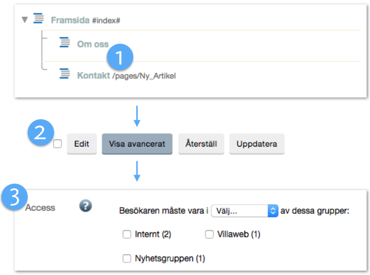Om ni vill att en sida endast ska visas för medlemmar i en eller flera grupper gör ni följande: