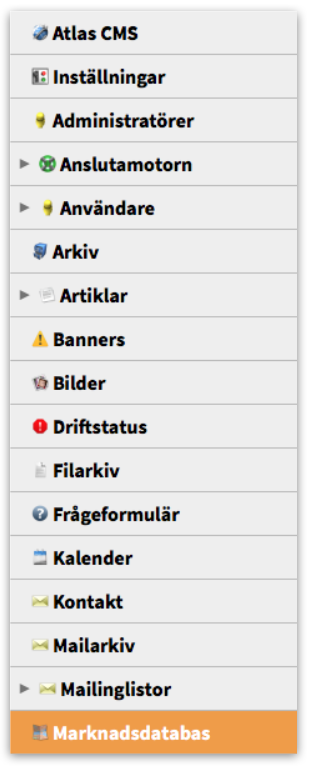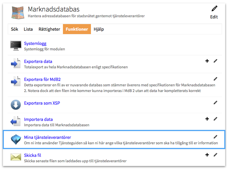 De stadsnät som inte använder Tjänsteguiden måste manuellt dela ut Marknadsdatabasen till sina leverantörer. Alla leverantörer måste vara registrerade på Stadsnätsportalen och ha fått rättigheter till databasen.Registrerade tjänsteleverantörer syns i Atlas CMS > Marknadsdatabasen under fliken Funktioner.