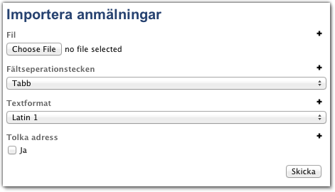 Där kan ni välja en textfil för att ladda upp anmälningar som då ska kopplas till rätt adress automatiskt om den finns i databasen.