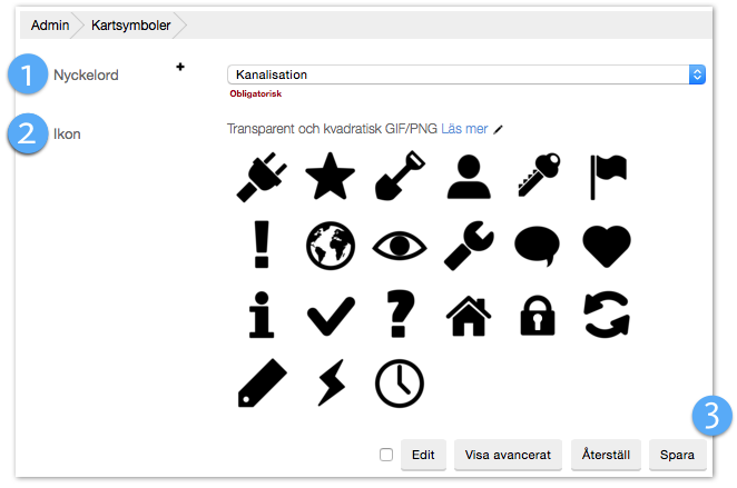 Via modulen Kartsymboler kan ni välja mellan ett antal olika symboler som ersätter "standardplupparna" på områdessidans automatiska karta. Detta görs via nyckelord.