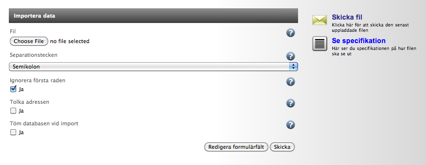 Gör dina val i formuläret och skicka in din datafil som ska vara formatterad enligt anvisningarna i Masterfilen.