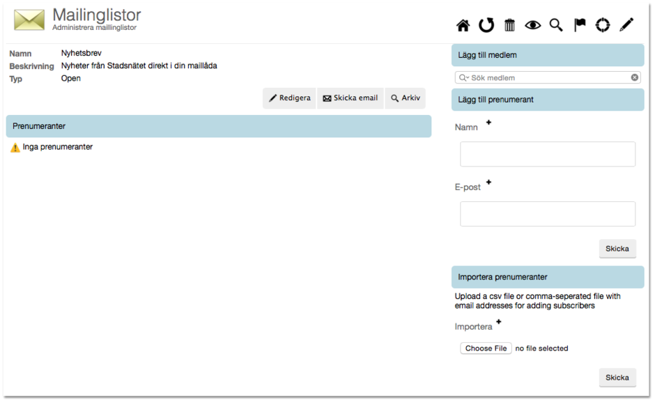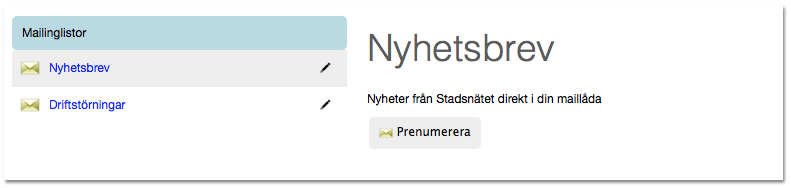 Klicka på Lägg till för att skapa ny lista. Du kan välja om den ska vara öppen eller sluten, d.v.s. om den ska synas publikt eller inte.Klicka på en lista för att redigera, skicka e-mail eller lägga till prenumeranter. Du kan även importera tab- eller semikolonseparerad lista med mailmottagare (Namn; epost) i t.ex. .csv eller .txt -format. Klicka på Lägg till medlem för att lägga till befintlig medlem som prenumerant i listan.