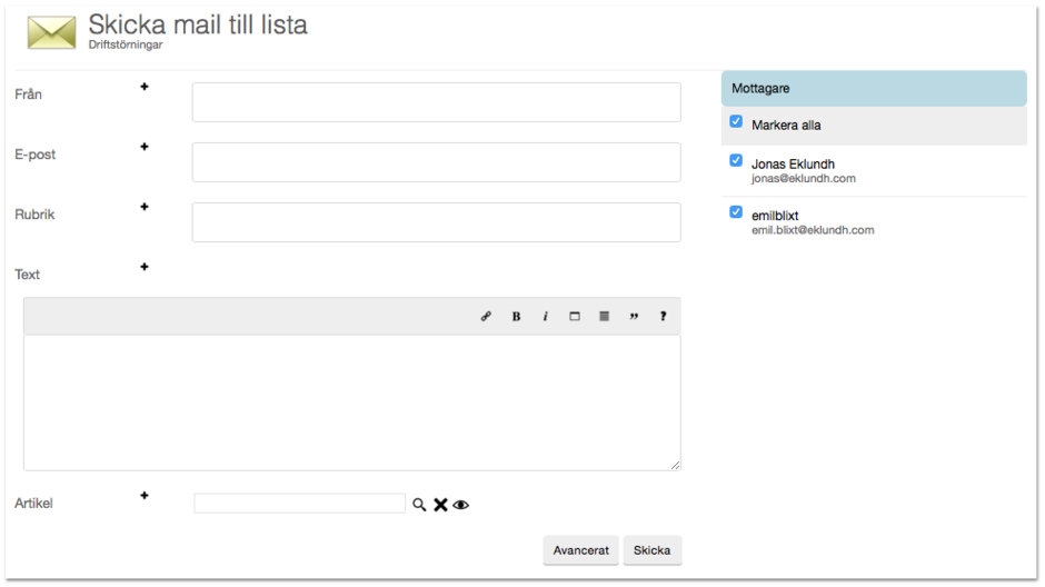 Klicka på Skicka mail för att komma till formuläret nedan. Här kan du redigera avsändare, skriva en text och/eller välja en artikel för utskick. Redigera mottagare eller välj alla i högerspalten.