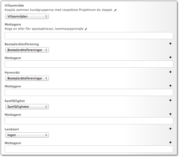 Skriv i e-postadresser för de mottagare som är aktuella för mailutskick i de olika kategorierna. T.ex. kontaktpersoner i ett villaområde, entreprenörer etc.