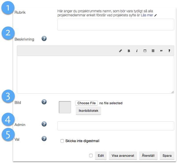- Admin Skriv in användarnamnet på den som ska vara administratör för projektrummet. Ytterligare administratörer kan läggas till senare från projektrummet. (Lägg till användare och klicka på stjärnan för att göra dem till admin)