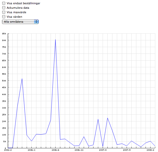 Det finns nu en ny statistikmotor i villamotorn som visar ett enkelt diagram över hur det har gått med alla områden eller specifika områden. Detta för att ge en överblick över när mest intresseanmälningar/beställningar har kommit in för att kunna göra en avstämning av hur till exempel en reklamkampanj har gått.