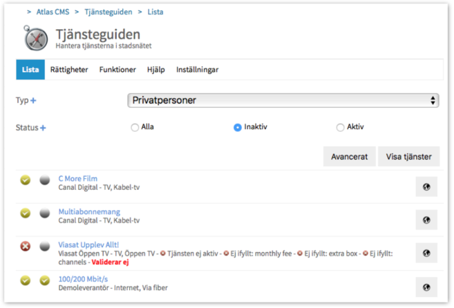 Under fliken Lista visas som standard alla icke aktiverade tjänster. I flitreringsalternativen kan du välja att visa Alla, Inaktiva eller Aktiva tjänster. Klicka på Avancerat för att även sortera på Tjänsteleverantör och Kategori.Var hittar jag Tjänsteguidens inställningar?