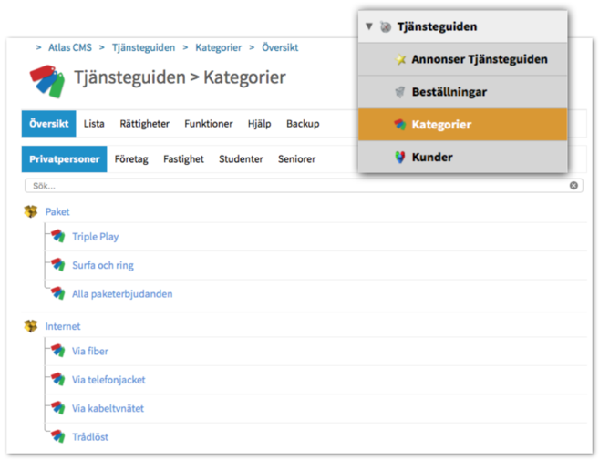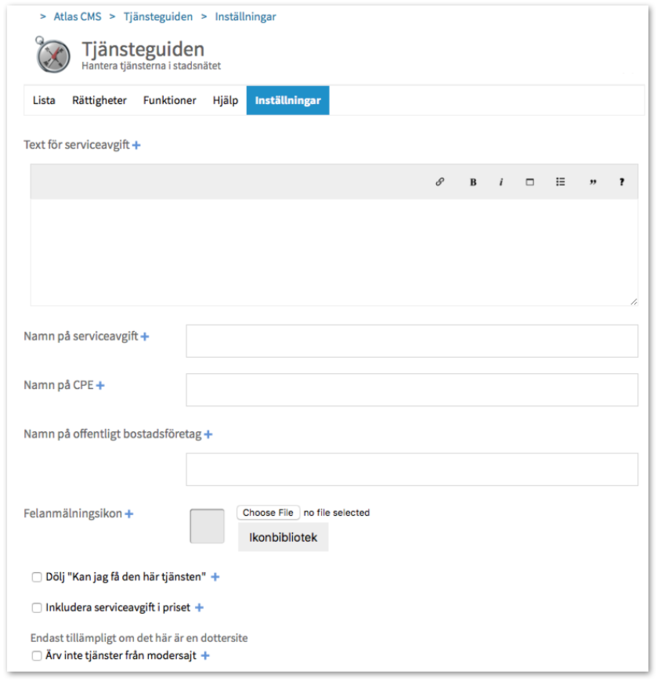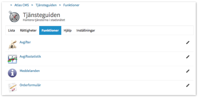 Klicka på Atlas CMS för att komma till listan med moduler eller gå till er Tjänsteguide och klicka på länken nere i adminlisten. Klicka därefter på Tjänsteguiden i listan för att öppna modulens funktioner i högerspalten och för att fälla ut undermoduler.