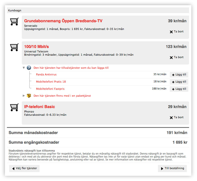 Tjänster och produkter som har ett samband och som båda är godkända stadsnätstjänster kan kopplas samman i Varukorgen.