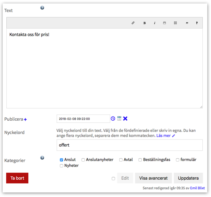 Vill ni dessutom få ut ett meddelande till aktuell adress kan ni göra det genom att först ange ett nyckelord, t.ex: offert, i fältet keywords på adressen. Sen skapar ni en artikel med önskad text > kryssar i kategori Anslut och anger nyckelord offert längre ner i artikelformuläret.