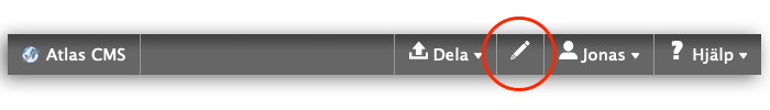 Adminläget i Atlas når du via den lilla pennan i botten på sidan, vilket i sin tur visar de olika adminkontrollerna för de moduler som finns på sidan.
