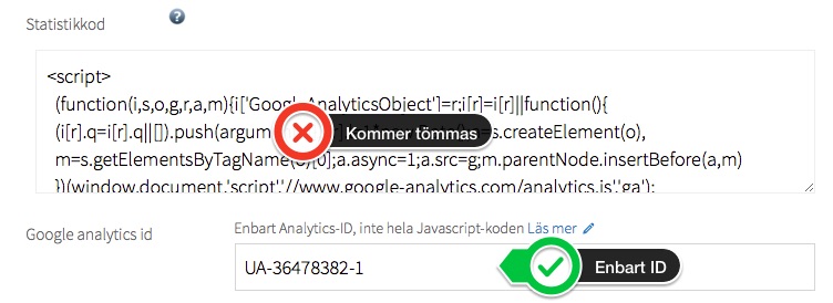 Så från och med på onsdag den 14 december så kommer vi rensa era fält med "Statistikkod" och så har vi ett nytt fält för "Google Analytics ID" där bara ID-koden för ett Analytics-konto anges, så fixar vi resten av statistikkoden automatiskt åt er.