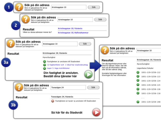 3a) Genom att klicka på sin adress får besökaren mer information om fastigheten och vilka lokal-ID som har ett stadsnätsuttag. Klickar han vidare får han fram information om uttagsnummer och Layer 2/Layer 3.