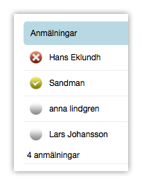 Om du för muspekaren över ett anmält namn finns två ikoner till höger. Den gröna bocken klickar du på för att markera att personen var närvarande och soptunnan om du vill radera namnet från listan.