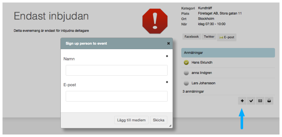 Plusknappen använder du för att bjud in/lägga till deltagare manuellt.Bocken skapar en incheckningslayou anpassad för en iPad/läsplatta. I den vyn kan du snabbt och smidigt pricka av alla som kommer (eller låta dem göra det). Du kan även lägga till oanmälda som kommer.