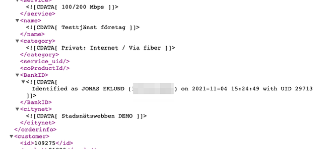 Även i API:et följer informationen med. Här bör era API-implementationer uppdateras så att om det finns ett värde i det här fältet så finns det en BankID-signering, och se till att spara det värdet in i era egna system då beställningsdatabasen rensas efter en viss tid.