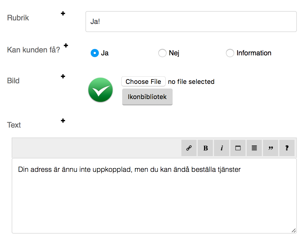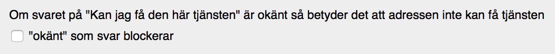 Tidigare fanns det en global inställning i Tjänsteguidens inställningar var "Okänt" status betydde, som till exempel om en kund söker på sin adress och Marknadsdatabasen inte har information om kundens porthastighet, om det fanns en CPE eller om TV kan levereras så är status "okänt" och standardinställningen är att tillåta beställning även om status är okänt men med den globala inställningen kunde man ändra det till att "okänt" inte tillät beställning, nu kan man bestämma det per separat "okänt"-svar i MeddelandefunktionenAnvänd AdminTjänsteguidenMeddelanden för att redigera meddelanden för "Internet: Ingen kapacitetsinformation i databasen", "Telefoni: Ingen CPE-information i databasen", "TV: Ingen TV-information i databasen" samt "Datum för anslutning är i framtiden" för att avgöra hurivida någon av dem tillåter eller inte tillåter beställning i Tjänsteguiden.