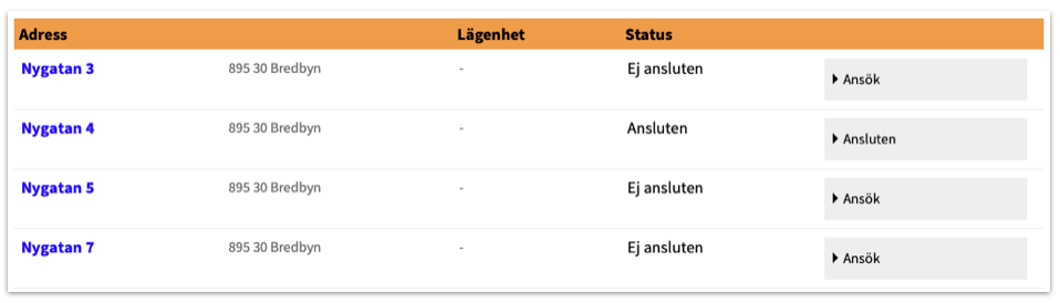 När kund söker på en ofullständig adress i Anslutamotorn (ex: "Nygatan" ist för "Nygatan 5") visas en lista med adressförslag där kund får klicka på sin adress. (Om ni inte kryssat för "Adressök visar endast exakt träff", då måste kund söka på fullständig adress för att få träff) I denna lista visas även status för respektive adress