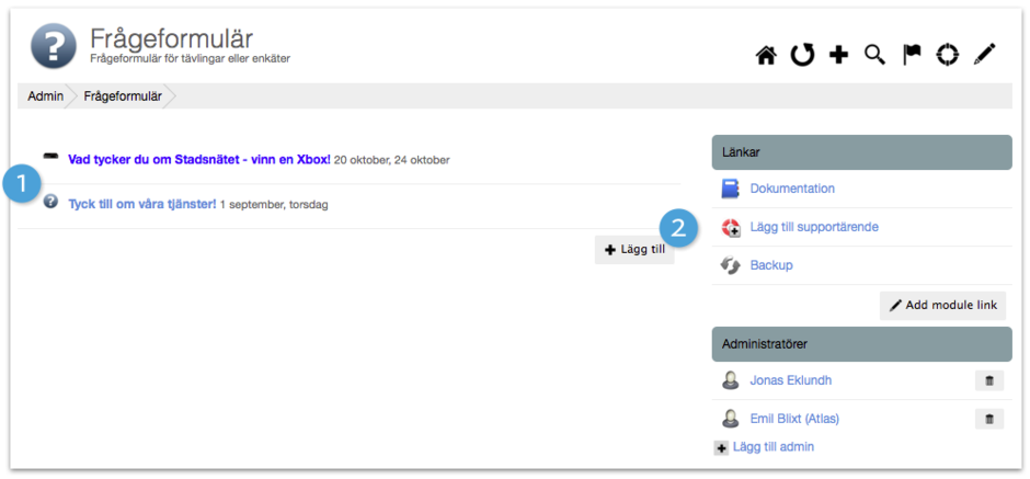 I admin, klicka på modulen Frågeformulär. Klicka på Lägg till för att skapa ny enkät/tävling.