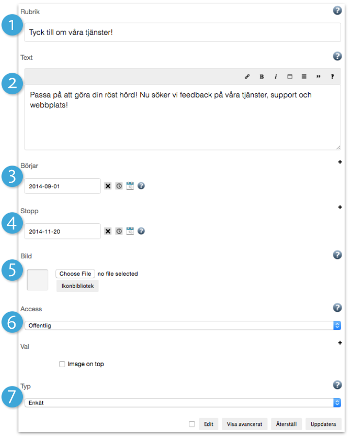 Du kan t.ex. ha en banner med tävlingar på förstasidan eller länka till enkäter på områdessidor.
