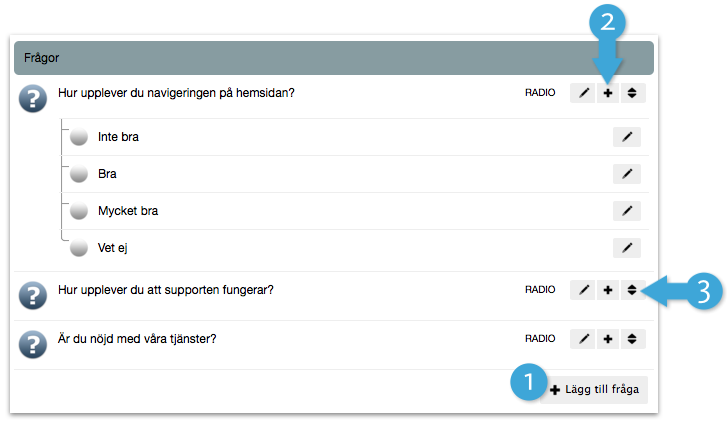 - Klicka på Lägg till för att lägga till ny fråga. Du väljer även på vilket sätt svaren ska ges. Väljer du radio kommer svaren upp som klickbara knappar där endast ett svarsalternativ kan väljas. Väljer du checkbox kan flera svarsalternativ väljas. Väljer du textruta kan svar anges i fritext.