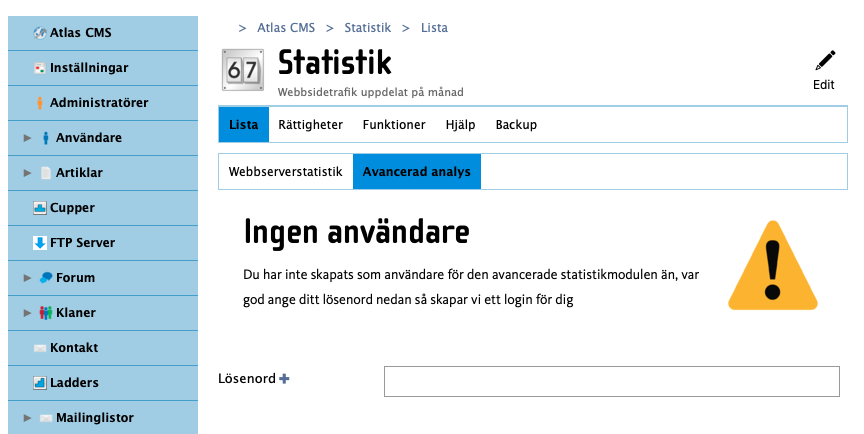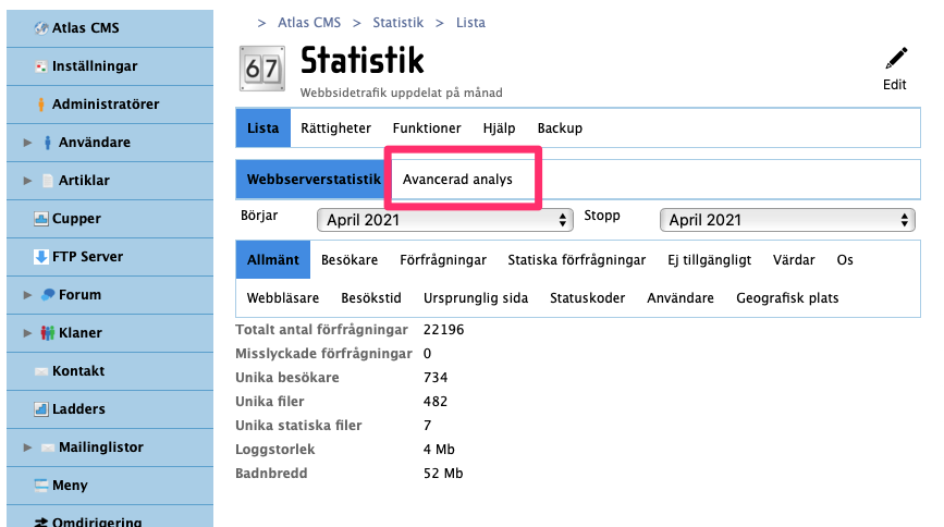 Funktionen är inbyggd men måste aktiveras, gå till Atlas CMSStatistik (om du inte ser den modulen, kontakta oss via supporten) och klicka på "Avancerad analys"