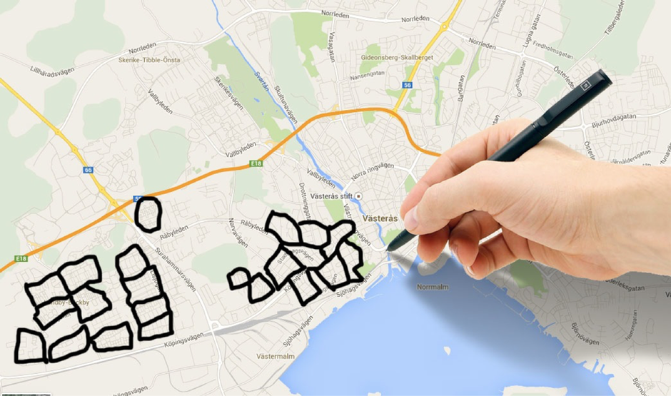 Ta fram kartan och rita in de områden ni vill ansluta. Det kan var allt från tre, fyra områden ni vill börja med upp till hela kommunen. Områdena bör inte vara för stora, max 400-500 adresser, gärna mindre, för att vara hanterbara både i Anslutamotorn och rent praktiskt.