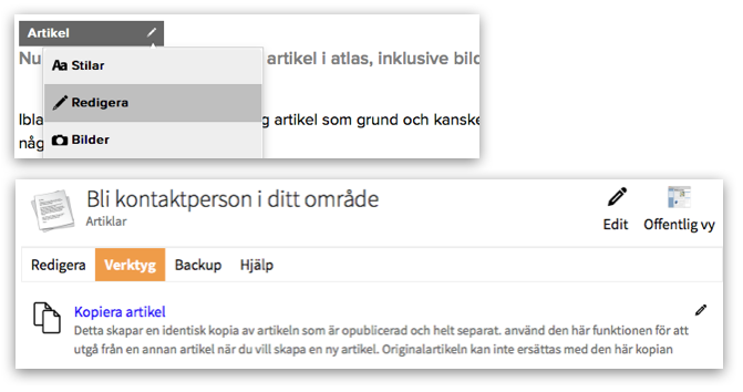 Gå till aktuell artikel, klicka på pennan nere till höger för redigeringsläge, sen på Redigera i artikelmodulens grå list. Klicka sen på fliken Verktyg ovanför artikelformuläret och till sist på Kopiera artikel. Detta skapar en opublicerad redigerbar kopia av artikeln.