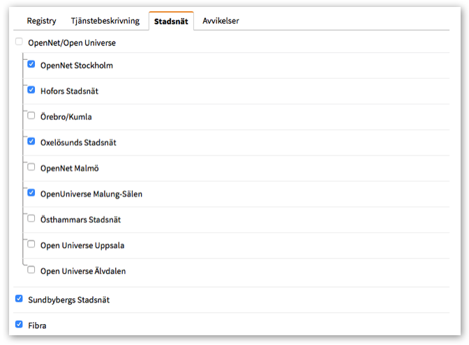 Under fliken avvikelser kan du ändra information i tjänster i ett eller flera specifika nät. I sökrutan kan du söka efter Stadsnät eller andra parametrar som t.ex. startavgift.