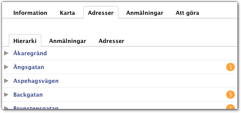 Under fliken "adresser" så har det alltid funnits en hierarkisk lista över gatunamn och anmälningar under dem. Den här listan har varit lite svår att underhålla och en hel del buggfixar har lett till flera andra småproblem. Vi ber om ursäkt detta och ska börja se över hur vi kan förenkla och förbättra den här informationen.