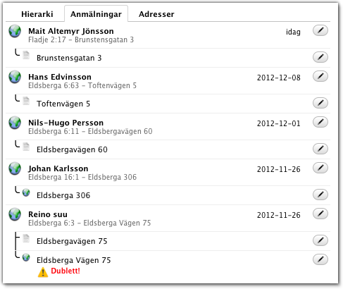 Som ni ser så får ni en lista på alla anmälningar ni fått in - och till skillnad från hierarkin så hamnar dom inte som barn till en adress, utan systemet försöker matcha ihop den adress som den hör till, och varnar om det finns dubletter, eller om en adress saknas! Här kan ni redigera anmälningen (och adresserna) direkt också. Och på den här bilden ser ni också ett exempel på data som är inkorrekt på det sätt som beskrevs ovan. Kunden sökte på en adress, fann den inte och lade till den, det skapades då en dubblett med samma fastighetsbeteckning. Ikonen visar vilken som är skapad av kunden och vilken som är skapad via importen