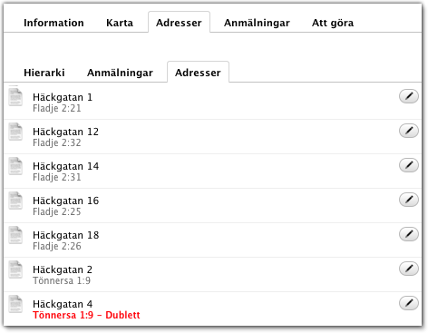 Här ser ni alla adresser kopplade till området, och med varningar om det finns dubletter i underlaget, vilket givetvis ställer till det med sammanställningar och statistiken, så man kan enkelt se och åtgärda sådana problem. Var dock försiktig, för den här listan visar inte om det finns någon anmälan kopplad till adressen, så eventuella kopplingar därimellan kan tappas om man ändrar datat - men det syns ju i så fall på Anmälnings-fliken.