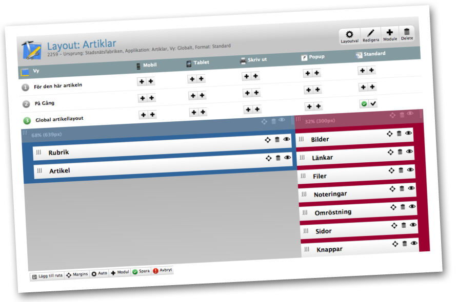 Atlas CMS har en layoutfunktion som är oerhört smidig när man vill förändra en webbsidas layout, lägga till eller ta bort olika sidmoduler eller skapa olika layout för olika artikelkategorier.